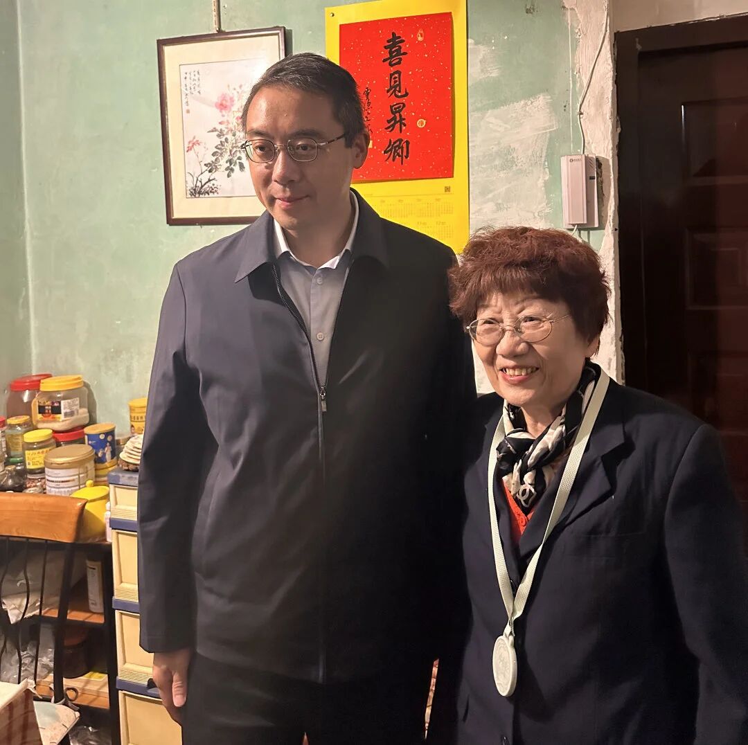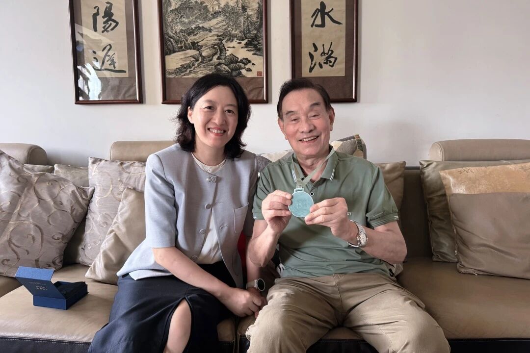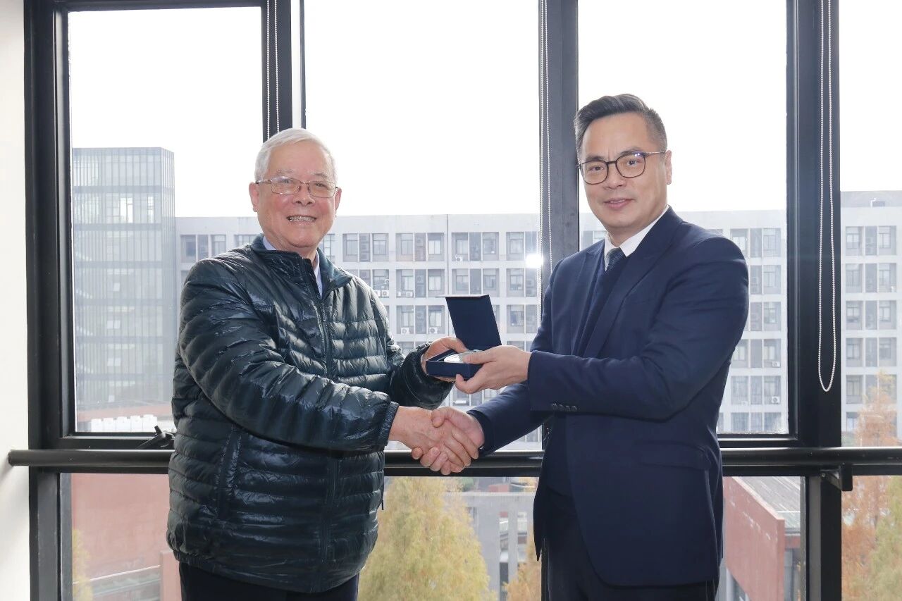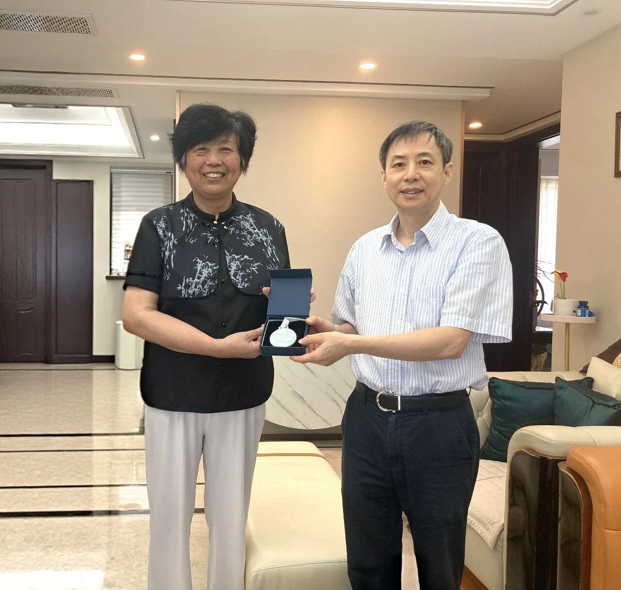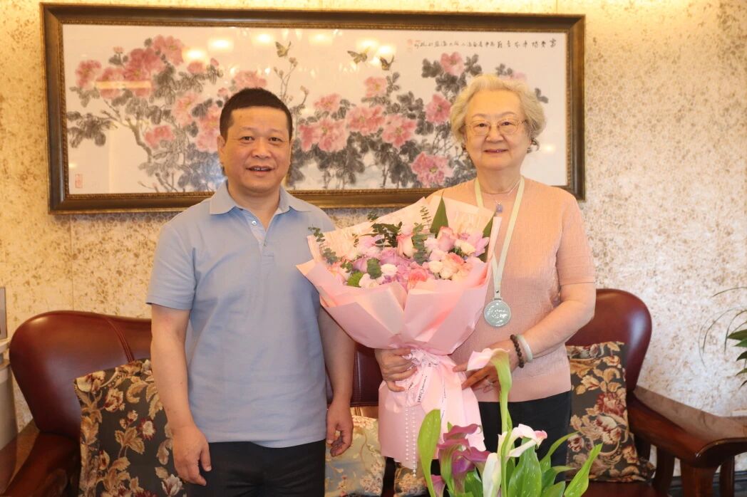 省委会副主委、杭州市委会主委於卫国看望杭州市委会原副主委何嘉琳并送上纪念章。