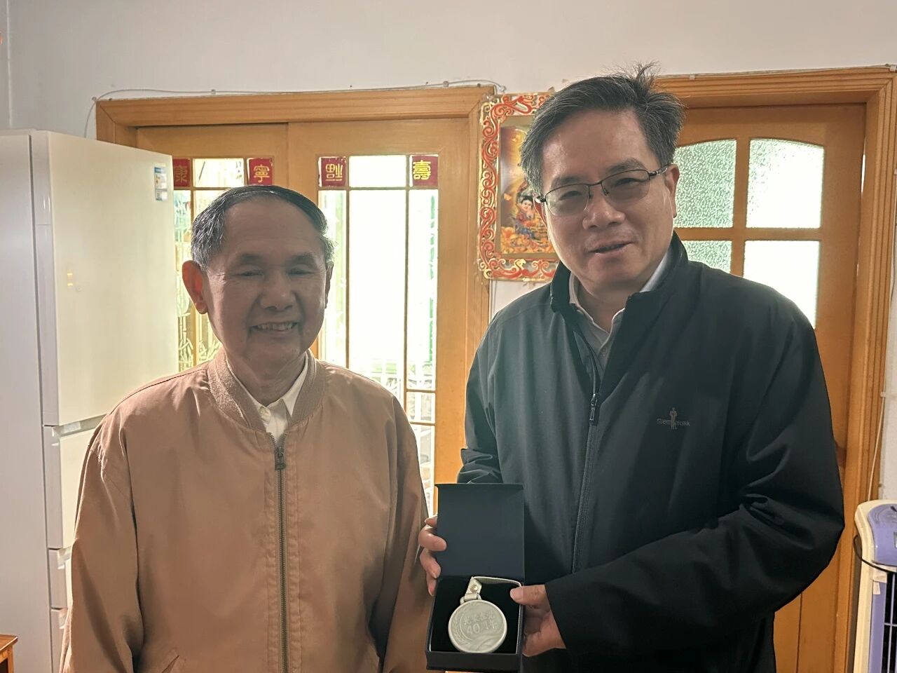 省委会副主委、宁波市委会主委陈为能看望宁波市委会原副主委韩智斗并送上纪念章。